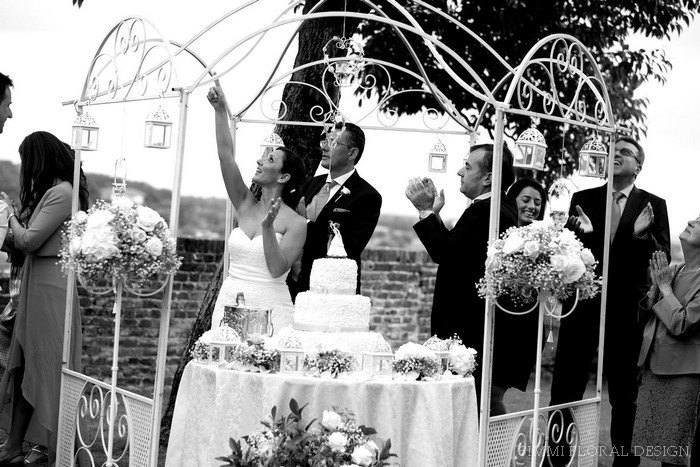 Ogni dettaglio del matrimonio di Sabrina e Massimo, dai cartelli personalizzati lungo la salita del Castello di San Giorgio all’elegante e ricca confettata, al buffet di dolci tutto è stato studiato su misura per questi sposi speciali, personalizzato con il loro logo elaborato insieme e soprattutto curato nei minimi dettagli. Sabrina e Massimo, grazie anche alla gentile disponibilità di Rossana del Castello di S. Giorgio e all’ottimo Catering Bon Ton, hanno “coccolato” i loro ospiti in ogni momento del ricevimento. Si vede che ci tengono veramente a tutti gli invitati in ogni momento, anche in quello della bomboniera, vogliono lasciare un ricordo bello e gradito a chi ha condiviso con loro la gioia di una giornata speciale: una doppia bomboniera, un prezioso oggetto in argento e un’elegante sacchetto porta confetti in seta, tutto rigorosamente “by Simmi”.