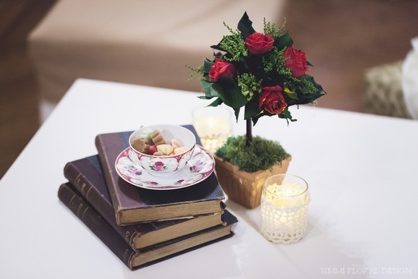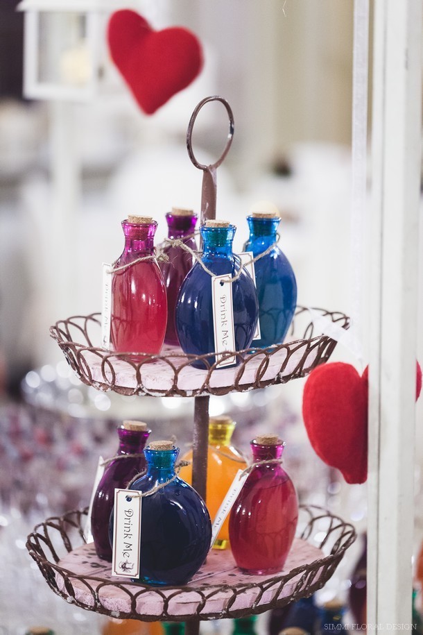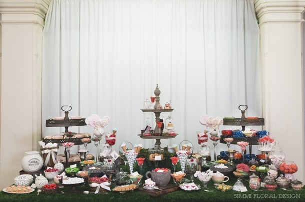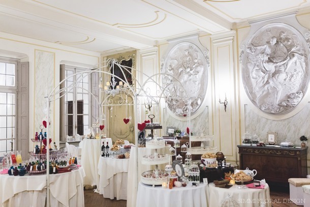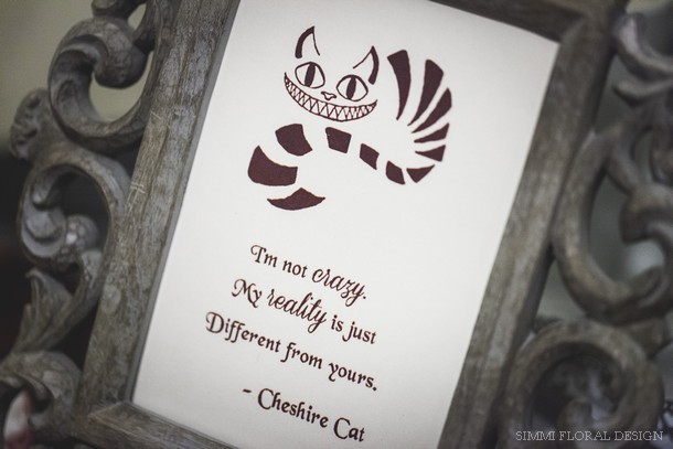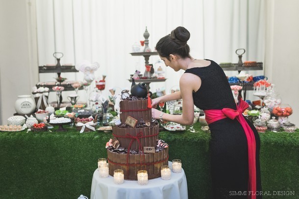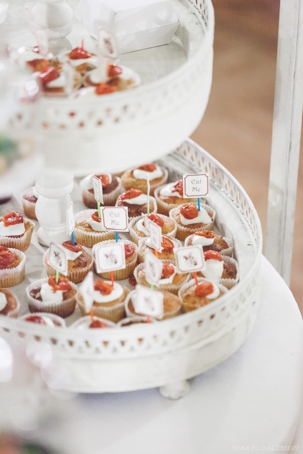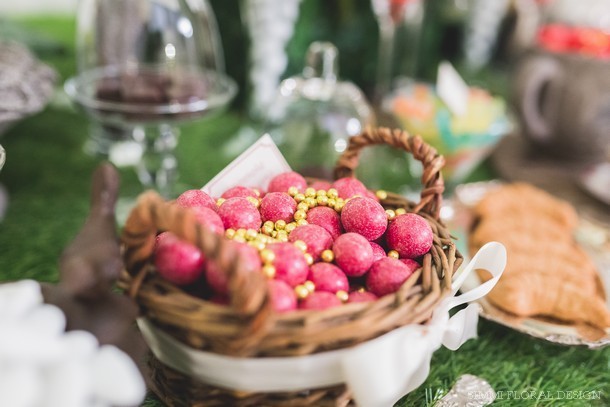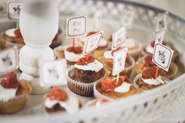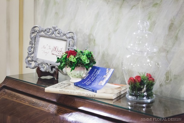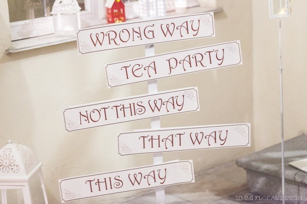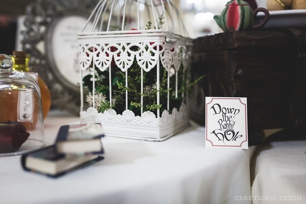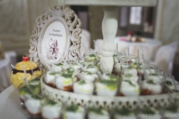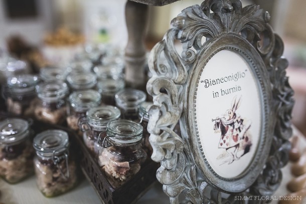 Terzo punto – Come? – Trovato il posto mi sono messa a pensare al tema, non volevo un’anonima cena, ma un qualcosa di speciale per i miei invitati. Dopo ore di elucubrazione…l’ho trovato: Alice in Wonderland! Si! era quello che cercavo, raccoglieva in sé così tanti dettagli che mi rappresentavano: i libri, il the, il gatto (le mie tre bellissime gattine!) ed in generale un’idea di evasione, la possibilità di avere una serata diversa, di riposarsi dalla vita stereotipata e frenetica di tutti i giorni. Pensare a tutti i dettagli decorativi è stata la parte più bella di tutta l’organizzazione, giorno e notte ci siamo divertiti a studiare centrotavola, decorazioni, il grande gazebo in ferro battuto che abbracciava il buffet. Per una volta tutti i dettagli che di solito progetto e realizzo per i miei sposi li ho studiati per me, dall’invito al menù, al guestbook, ai centrotavola, alla confettata, alla degustazione di tè e tisane e soprattutto alla torta.