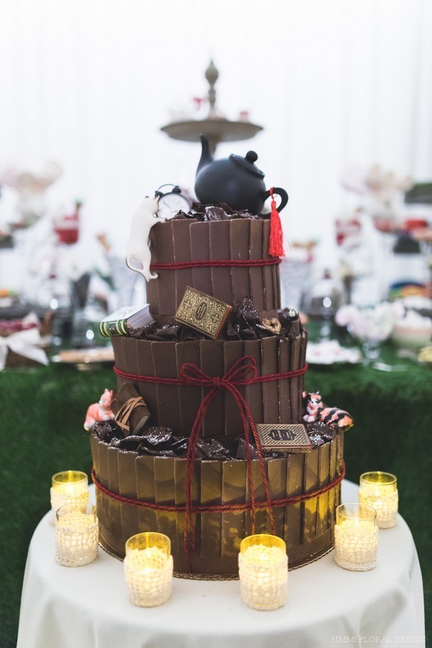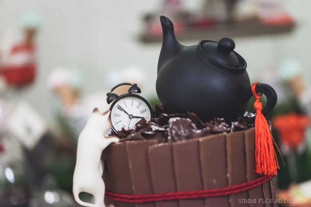 La festa doveva però avere un degno finale, una giusta conclusione, un torta bella, e soprattutto buona, realizzata in coordinato con l’atmosfera generale di “Wonderland”. Realizzata con pan di spagna al cioccolato con una farcitura di panna fragole e gocce di cioccolato, ricoperta da listelli di cioccolato – rigorosamente fondente- ed arricchita da una serie di dettagli dal valore simbolico…le mie tre gattine, i libri antichi, una teiera al posto del solito tocco…