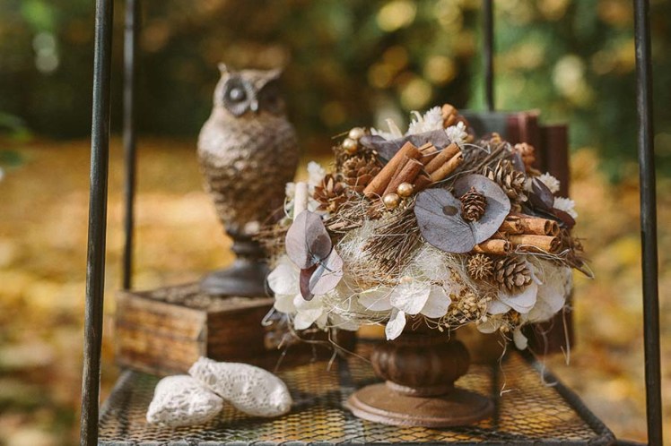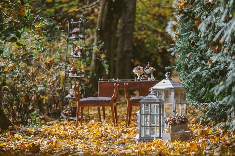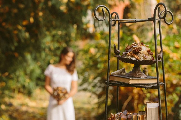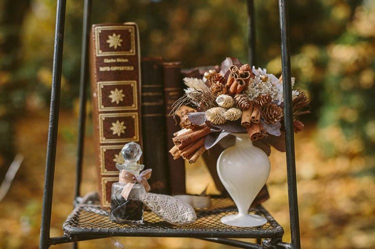 Il tavolo del rito, un’antica scrivania in legno, è decorato con libri antichi e piccole composizioni a tema, e posizionato sotto gli alberi autunnali, sopra un tappeto di foglie dai mille colori. Per il rito accanto agli sposi abbiamo scelto al posto della classica composizione un supporto a piani in ferro battuto, con oggetti antichi, libri, decori di bacche. A lato un tris di lanterne giganti in legno decapato e cassette anch’esse in legno di una vecchia azienda produttrice di cacao. L’effetto è semplice ma intimo e caldo. Le splendide foto di Nina Milani parlano da sole…