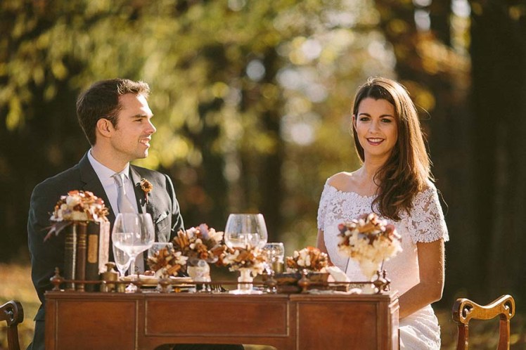 Abbiamo usato per la “mise en place” del tavolo degli sposi una scrivania antica in legno. Il centrotavola è composto da vasetti e alzatine in argento e porcellana con piccole composizioni dal tono autunnale. Anche qui ho preferito sostituire i fiori con le bacche, la cannella, le foglie essiccate e tanti altri elementi raccolti nel bosco, per dare all’insieme un’atmosfera naturale e spontanea. Il menu appoggiato sul piatto di ceramica vintage con sottopiatto oro antico è rifinito con un pizzo écru. Per dargli “quel tocco in più” ho messo una pralina di cioccolato al centro del nastro che chiudeva il menu insieme al tovagliolo, una piacevole sorpresa per chi si siede a tavola.