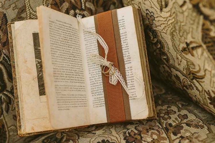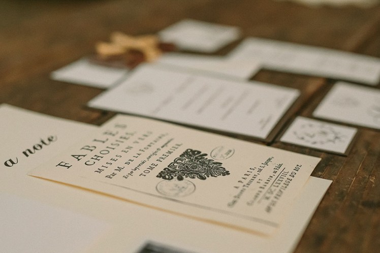 Anche gli altri dettagli sono a tema: un vecchio libro aperto, con un nastro di pizzo per gli anelli, sostituisce il classico portafedi, un botticino di vetro pieno di cioccolato in polvere col tag degli sposi diventa un simpatico favour. Il tableau è fatto con riproduzioni di stampe tratte dalle favole di La Fontaine. Ogni tavolo ha il nome di una favola e la storia è riportata sul segnatavolo in modo che ogni commensale possa leggerla e, perché no, imparare qualcosa!
