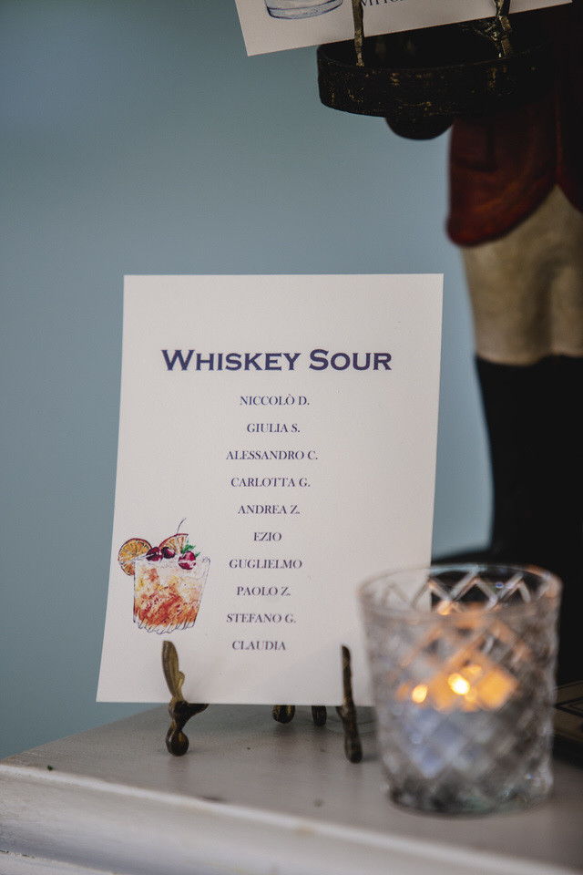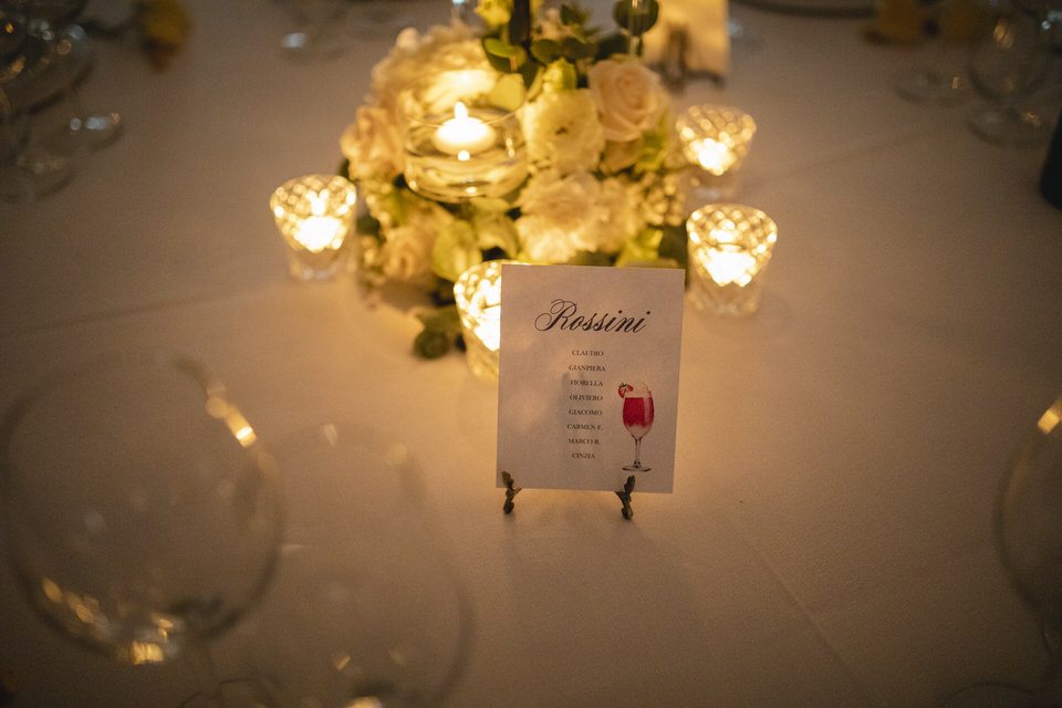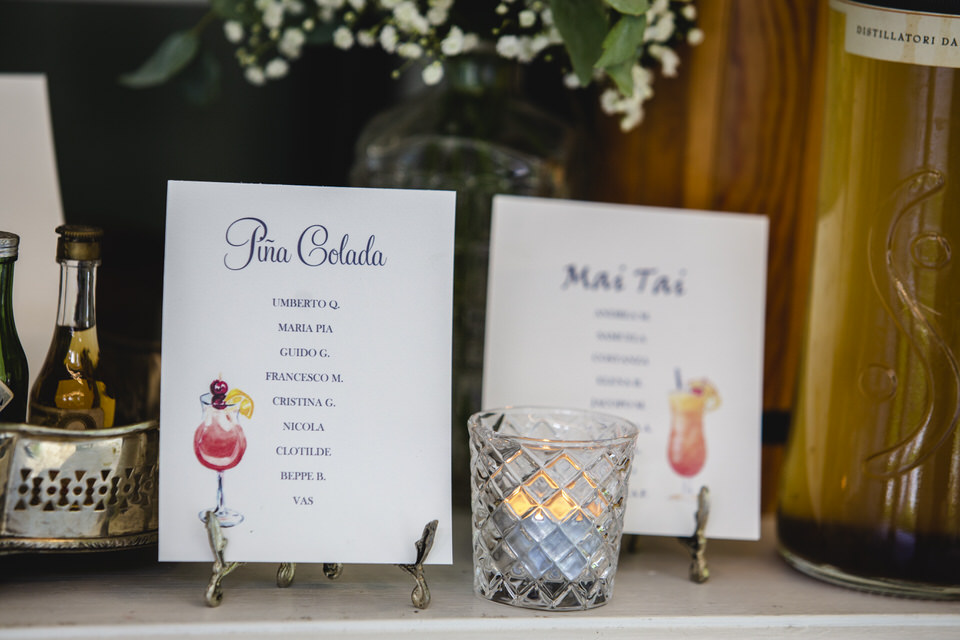 Sul dettaglio più bello ci dividiamo. Per la sposa è il bellissimo tableau de mariage realizzato con i nostri cocktail preferiti, con bottigliette, bicchieri e un sacco di colori, stampe, candele e fiori. Per lo sposo l’allestimento della sala con centinaia di candele accese ad una ad una da Camilla ed il suo team.