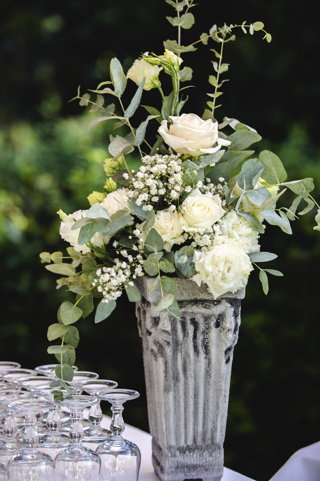 Il matrimonio di Maria Chiara e Luca è all’insegna dell’eleganza e della semplicità. Per loro, nuances delicate color panna con piccoli dettagli dalla tinta verde ottanio. Per l’allestimento floreale abbiamo scelto rose Vendela, peonie, ortensie, garofani, lisianthus e tanto eucalipto, pensati per un matrimonio dallo stile naturale ma dall’animo raffinato.