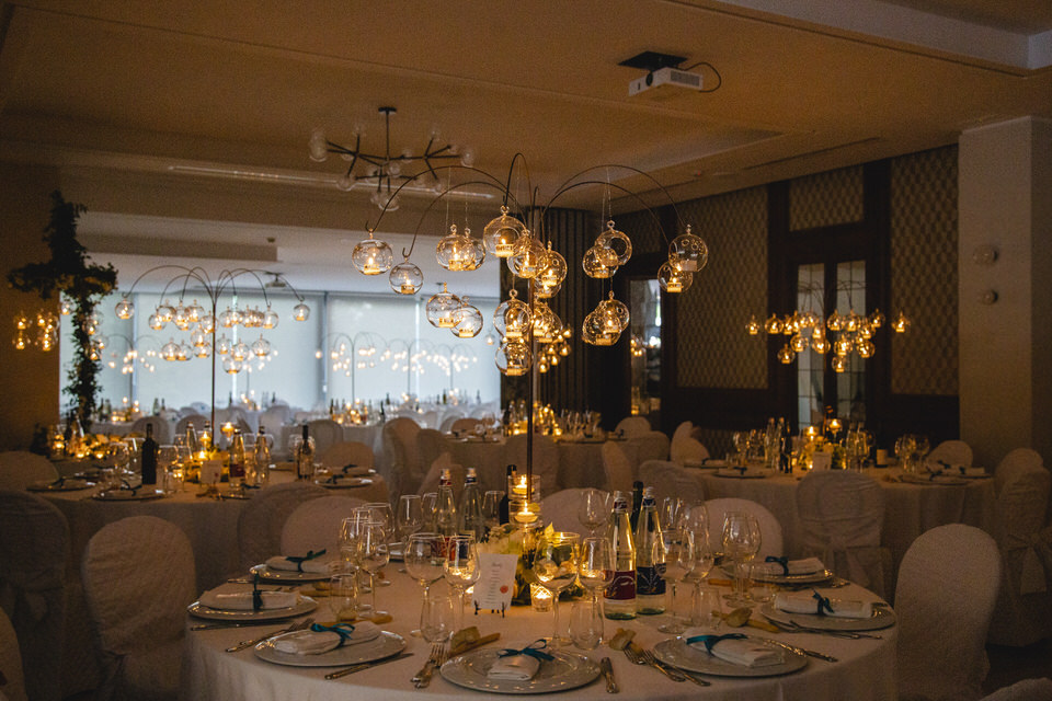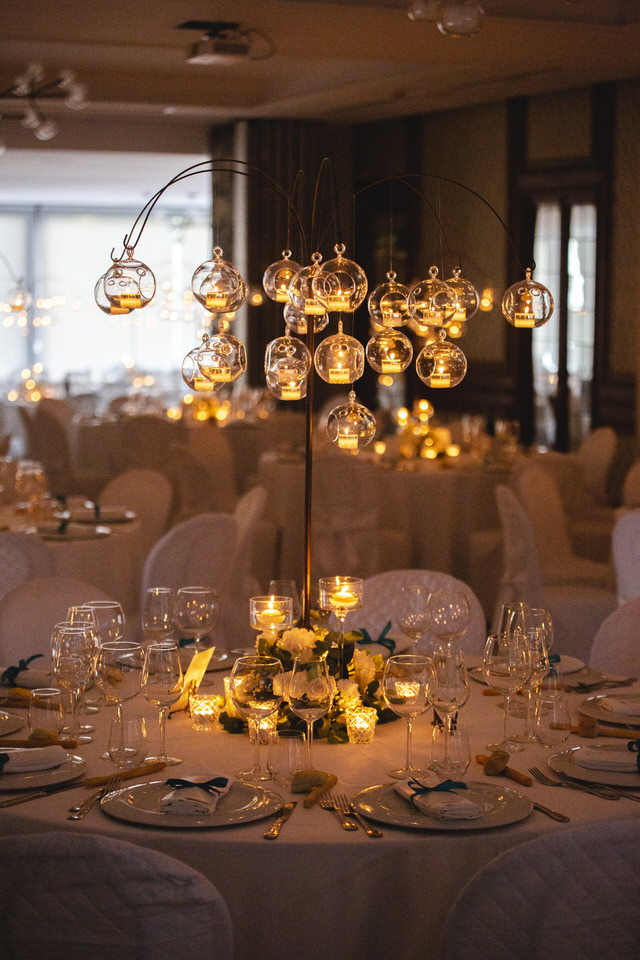 Più di 560 candele hanno inondato gli ambienti raffinati con la loro luce creando un’atmosfera suggestiva dai toni caldi e accoglienti. Per la sala della cena, abbiamo infatti costruito con il nostro fabbro dei candelabri dalla linea semplice caratterizzati da una struttura decisamente particolare… Avete presente le lampade da terra, quelle realizzate negli anni 60’ e 70’ e che hanno riempito migliaia di salotti? Bene, prendete quell’immagine, togliete tutti i dettagli tessili e pensate solo al disegno geometrico. Difatti nella parte terminale abbiamo progettato una struttura a lampada che si sviluppasse in più ramificazioni seguendo però un movimento verso il basso e non verso l’alto come accade di solito nei candelabri classici. Alle varie estremità dei candelabri abbiamo poi unito numerose boules di vetro illuminate al loro interno dalla candela, in maniera da diffondere la luce e creare un’atmosfera dai toni magici con mille punti sospesi nell’aria. Grazie agli scatti incredibili del Fotografo Nicola Genati e del suo staff siamo riusciti a fermare questo momento e a renderlo eterno…