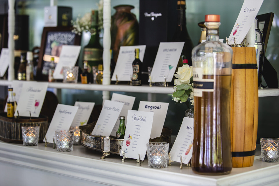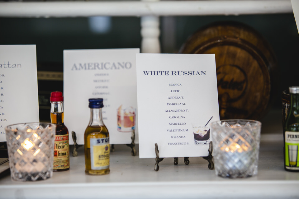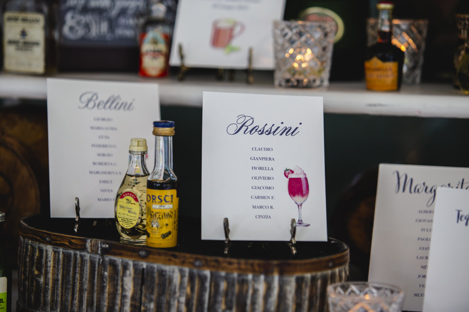 L’incantevole Villa Sassi, recentemente rinnovata, è stata da noi impreziosita con elementi floreali, sfumature delicate e dettagli in vetro e cristallo. L’elemento che abbiamo amato molto sia durante la progettazione che durante l’allestimento è stato l’originale tableau de mariage. Non nomi di fiori o destinazioni paradisiache, ma una riproduzione di un’antica ed elegante credenza da bar piena di bottiglie vintage e di miniature di vari distillati. Per questo tableau ci siamo ispirati ai bar o ai caffè letterari in voga negli anni passati, tipici di Torino. Dopo averlo delineato nella nostra testa e averlo disegnato su un pezzo di carta, abbiamo preso il nostro mobile Ladurée facendo quello che farebbe un pittore: iniziare a dipingere la propria tela. Fiori, distillati, bottiglie alcoliche, elementi vintage e cartoncini con la disposizione dei tavoli ispirati ai cocktail preferiti dai nostri sposi, hanno dato corpo alla nostra opera arricchendola e trasformandola in un vero e proprio angolo di un elegante “Bar” di Torino.