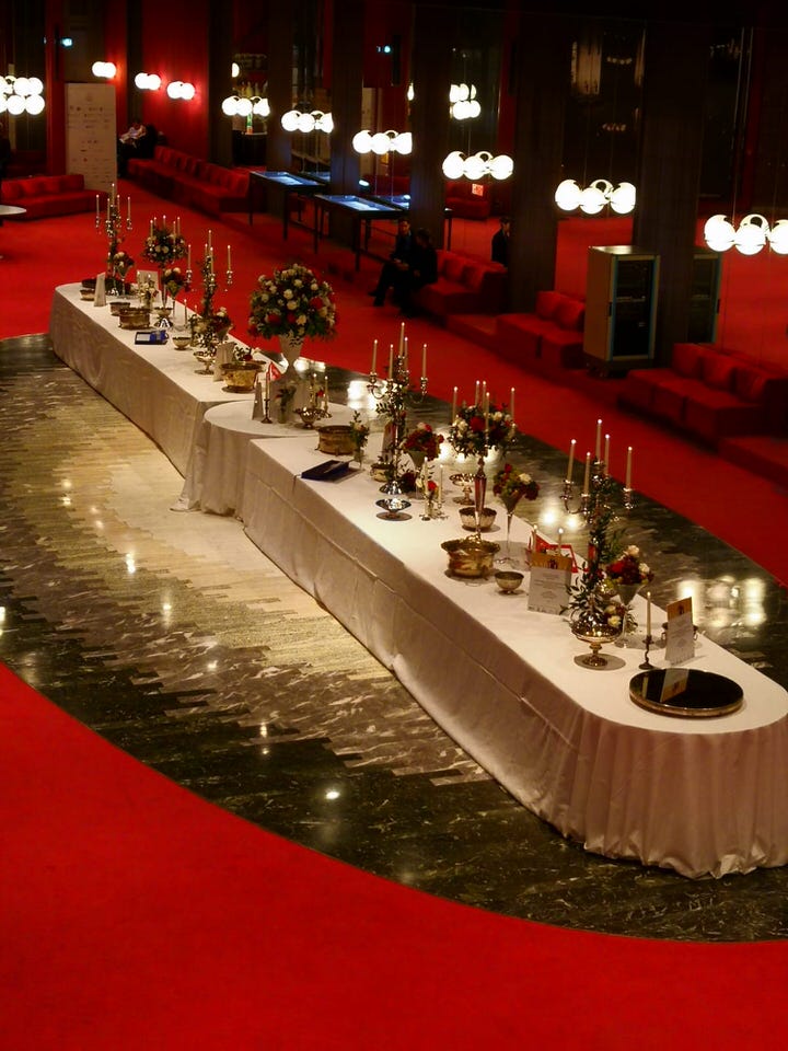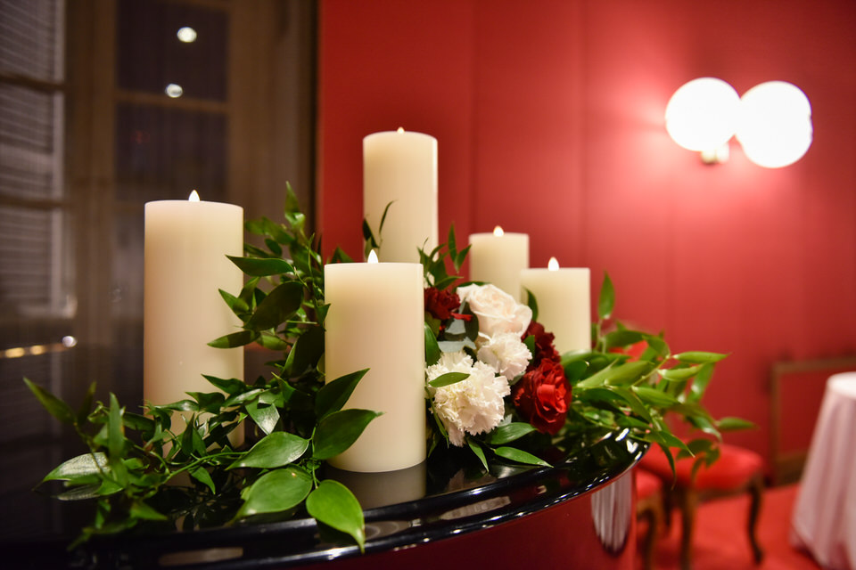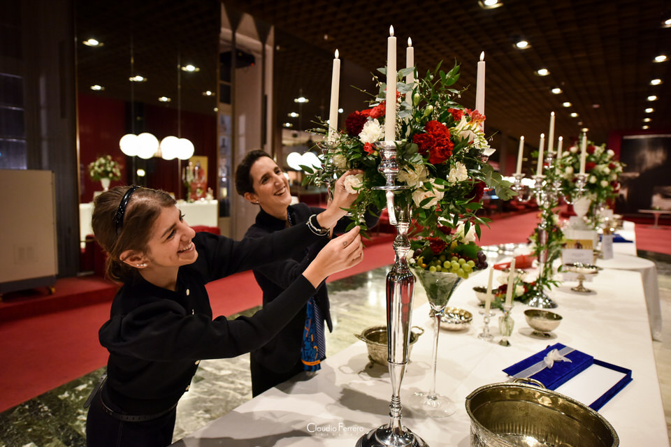 Ma non solo il foyer… abbiamo anche allestito la Sala del Caminetto. Anche qui abbiamo seguito lo spirito e lo stile dell’Opera inserendo maestose composizioni floreali sui buffet accompagnate dai dettagli di design senza dimenticare il tocco di foliage che impreziosiva le varie portate presentate dal Catering Stratta. Infine abbiamo allestito con le strutture dei candelabri in argento e con il fil rouge floreale anche l’area dei palchi e area stampa in modo da portare in tutto il Teatro lo spirito delgi anni di Verdi.