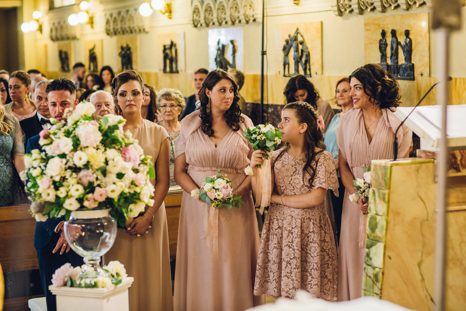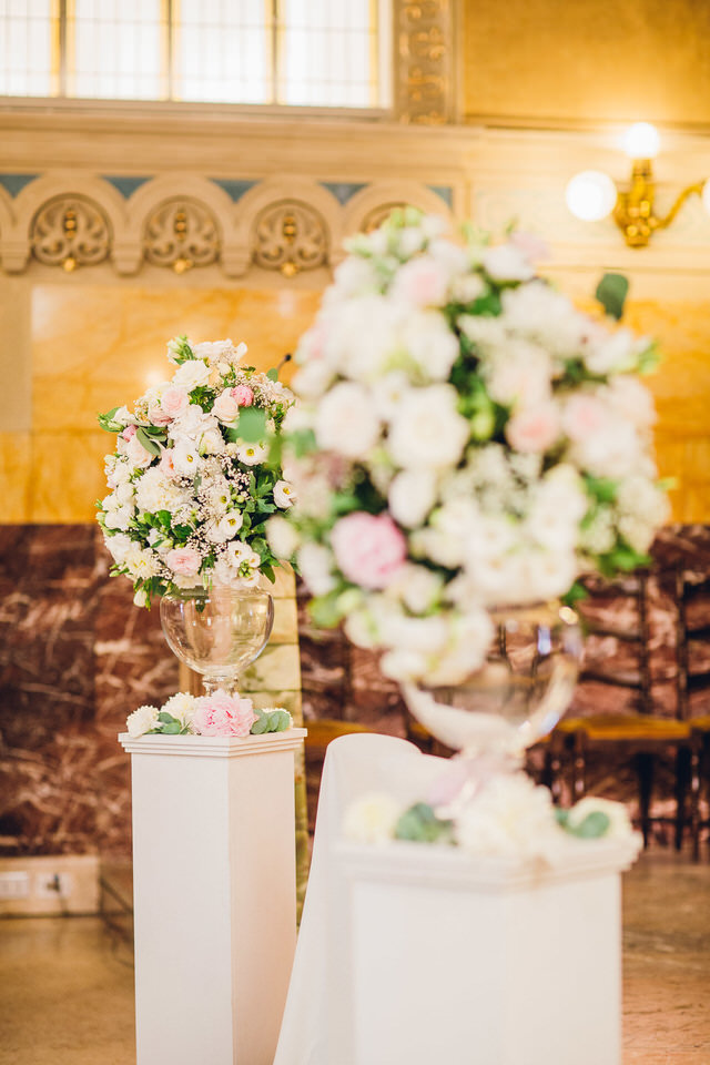 Per la decorazione della chiesa abbiamo realizzato, per incorniciare gli sposi, due colonne bianche con vasi in vetro impreziositi dalle composizioni floreali ricche di fiori e profumi che richiamavano le composizioni sui banchi. L’effetto finale? Una delicata cornice d’amore per questo momento indimenticabile!