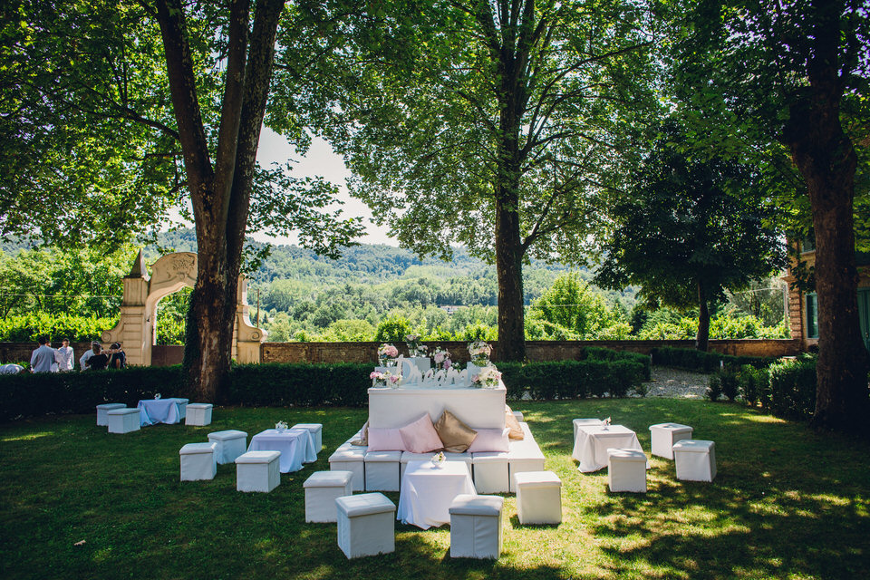 Una volta terminata la cerimonia gli invitati sono stati accolti nell’elegante parco di Villa Bria. Per l’aperitivo abbiamo costruito per i nostri sposi la nostra Isola del Gattopardo: un’elegante modalità di sedute in grado di accogliere gli invitati in uno spazio di relax, personalizzato nella decorazione e nei colori, per degustare un drink e chiacchierare sotto l’ombra degli alberi secolari di Villa Bria.