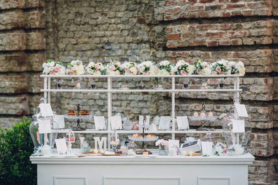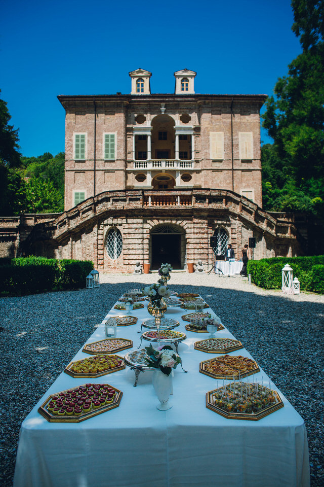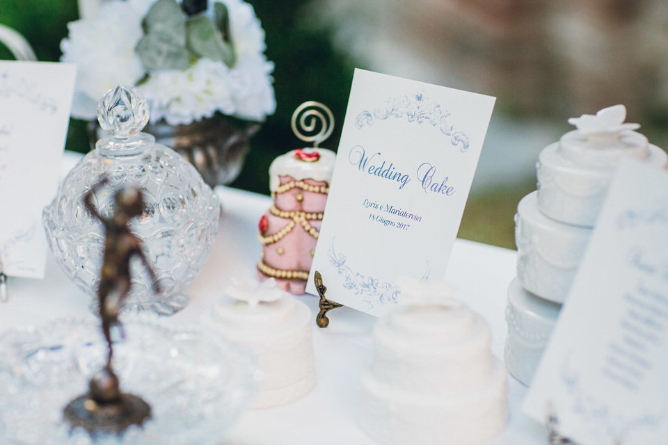 Dopo l’aperitivo la festa è continuata nella Galleria di Villa Bria. Tra dolcetti, alzatine e bon bon, abbiamo disposto i nomi dei tavoli, ispirati alla pasticceria, sul nostro bancone Laduree arricchito da fiori e dettagli. Su ogni tavolo gli ospiti hanno poi ritrovato la ricetta del loro dolce per potersi cimentare a casa!
