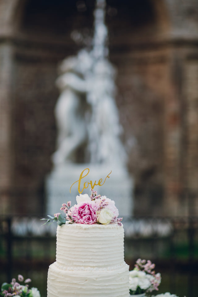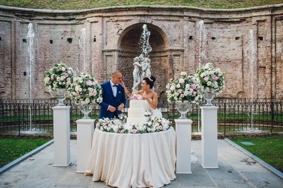 Per il taglio della torta il nostro intento era lasciare un ricordo negli ospiti, sempre seguendo gli elementi decorativi caratteristici della giornata, lussureggianti composizioni di fiori ed i giochi di luce e trasparenza del vetro. Avvolte dalla splendida fontana antica, le quattro colonne bianche di altezza diversa ospitavano vasi in vetro contenenti una rigogliosa composizione floreale… un’exploit di romanticismo e di dolci fragranze.