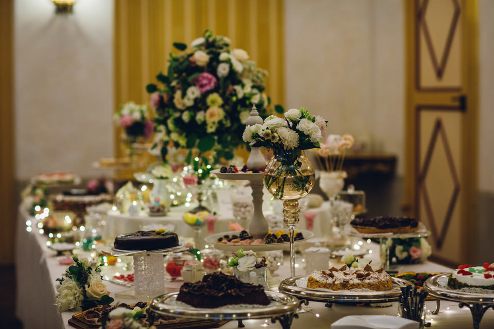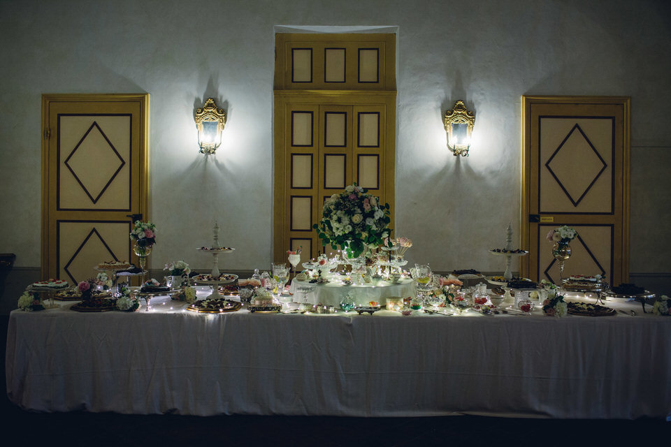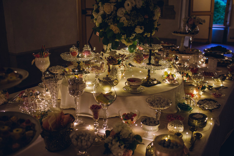 Un altro colpo di scena era in serbo per i più golosi, aprendo le porte del salone di Villa Bria hanno scoperto un’area gourmet dall’incredibile effetto wow. Seguendo i loro desideri dei nostri sposi abbiamo realizzato, insieme al catering, un tavolo lungo 6 metri colmo di tantissime golosità: dagli immancabili dragées alle delicate torte, dai lecca lecca alla fine pasticceria, dalle candele alle alzate di fiori, dai biscottini sino ai bon bon di ogni genere e fantasia…
