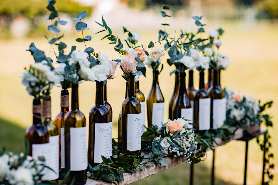Se si volesse unire uno stile botanico con il tema dei vini? Ecco il tableau che abbiamo realizzato per Charlotte e Giacomo alle Serre di Racconigi. Una trave in legno grezzo, su cui abbiamo poggiato una fila di bottiglie impreziosite dal tocco floreale e dal greenery dell’eucalipto e dell’edera… Un allestimento dalla linea semplice, ma molto romantica!