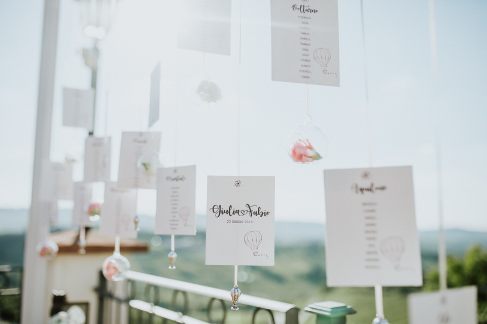 E cosa ne pensate delle mongolfiere? Chi ama la leggerezza dei “palloni volanti” potrà ispirarsi al matrimonio dei nostri sposi, Giulia e Fabio. Per il loro tableau de mariage, abbiamo appeso i cartonicini dei tavoli contrassegnati dai nomi dei venti alla nostra cornice gigante. L’effetto finale? Un tableau fluttuante come le mongolfiere in volo per un matrimonio ad alta quota.