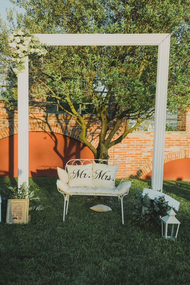 Di fronte al tableau abbiamo allestito l’angolo del photobooth. Per questo corner di intrattenimento per l’aperitivo abbiamo posizionato un’elegante panchina in ferro battuto, soffici cuscini, la nostra cornice gigante in legno, abilmente realizzata da mio papà e decorata dal dettaglio floreale. Props, accessori originali ed elementi in stile shabby hanno completato la scenografia.