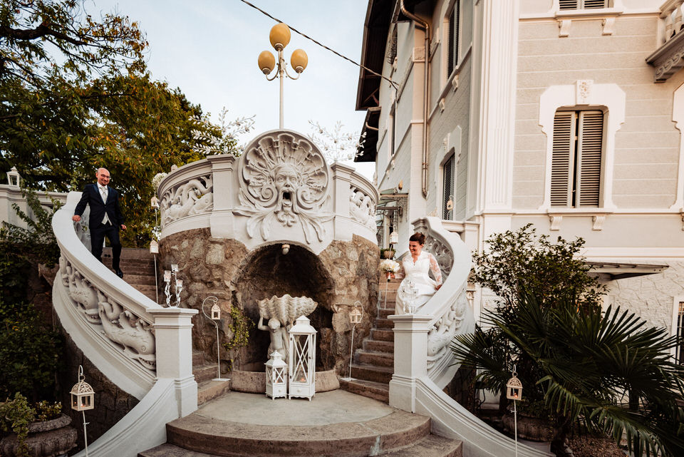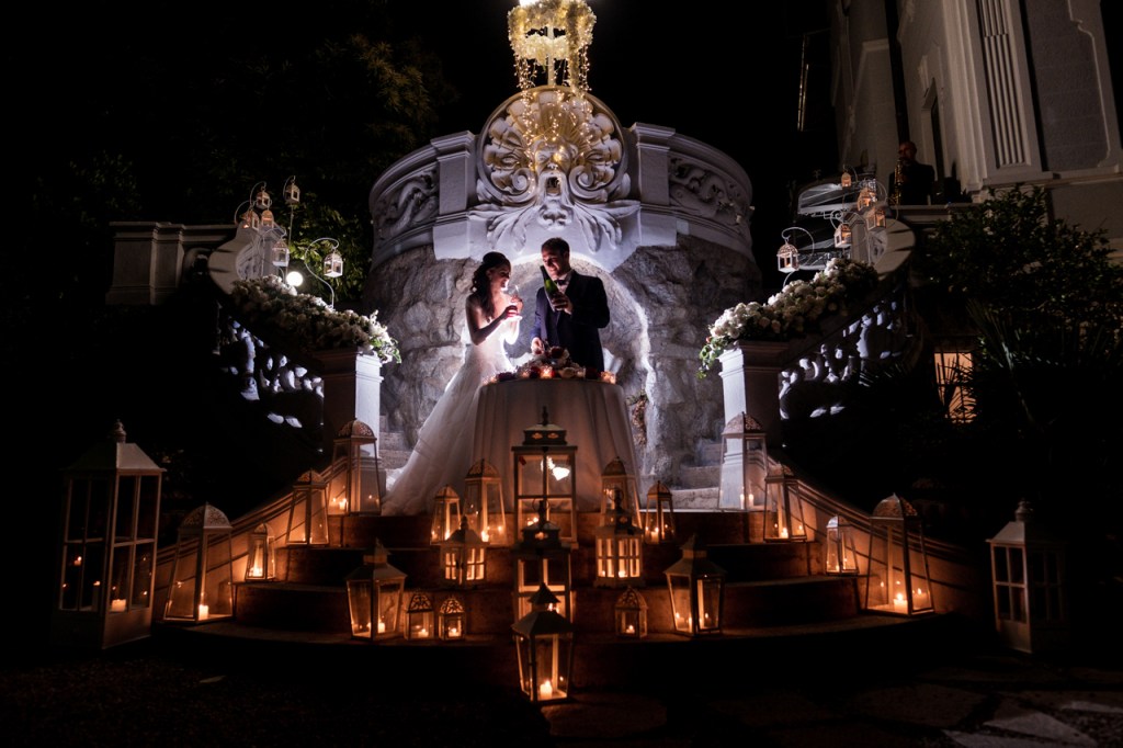 Un dettaglio che amiamo particolarmente è la scalinata. Tra candele, lanterne e fiori si crea una scenografia unica per il taglio torta lasciando un ricordo indelebile negli occhi degli invitati.