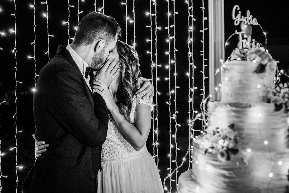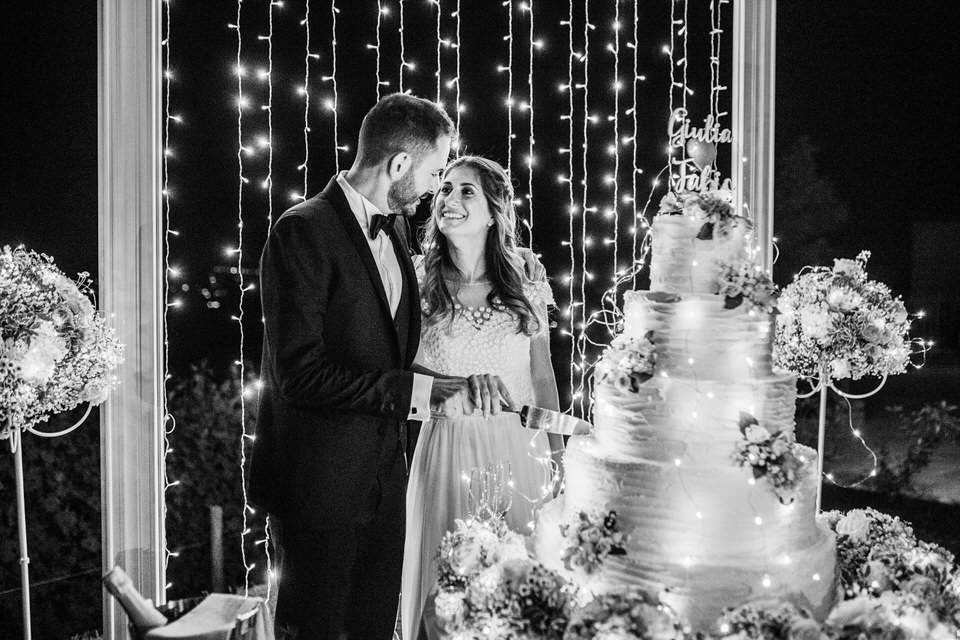 Dopo i piatti creativi della cucina piemontese dello Chef Claudio Cagliero, un corridoio di persone e di luci ha accolto i nostri sposi per l’arrivo della Wedding cake. Una cornice gigante accompagnata da una cascata di mini lucine ha reso perfetto questo momento.