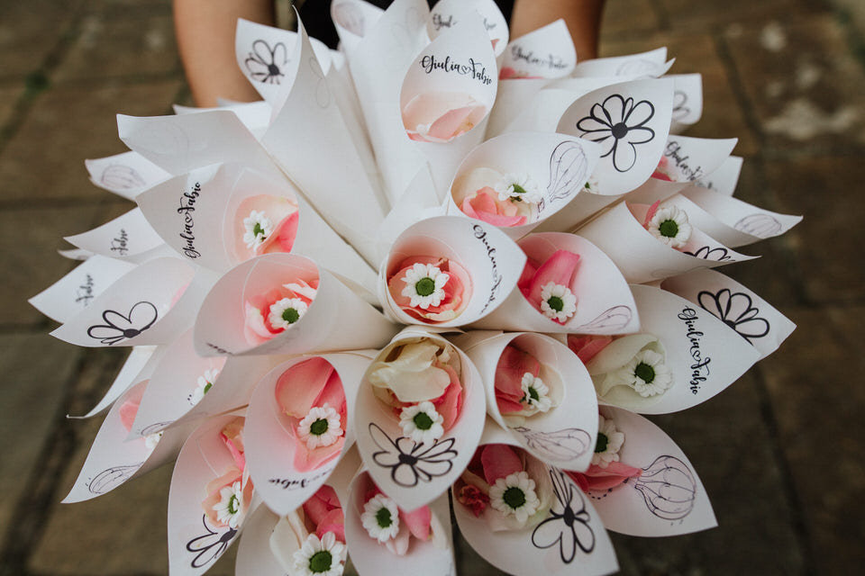 Abbiamo voluto seguire il fil rouge della giornata creando dei conetti personalizzati: richiamando il progetto tipografico con il logo degli sposi e mix di riso, delicati petali di rose e le immancabili margherite.