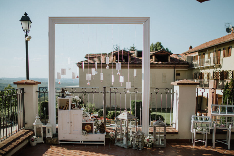 L’aperitivo sulla terrazza è stato un momento ricco di dettagli: dal Kissing tree ai piatti piemontesi, dalla mongolfiera avvistata dai nostri sposi appena giunti al Relais sino alla sorpresa da parte dello sposo. Un momento di condivisione e di emozioni.