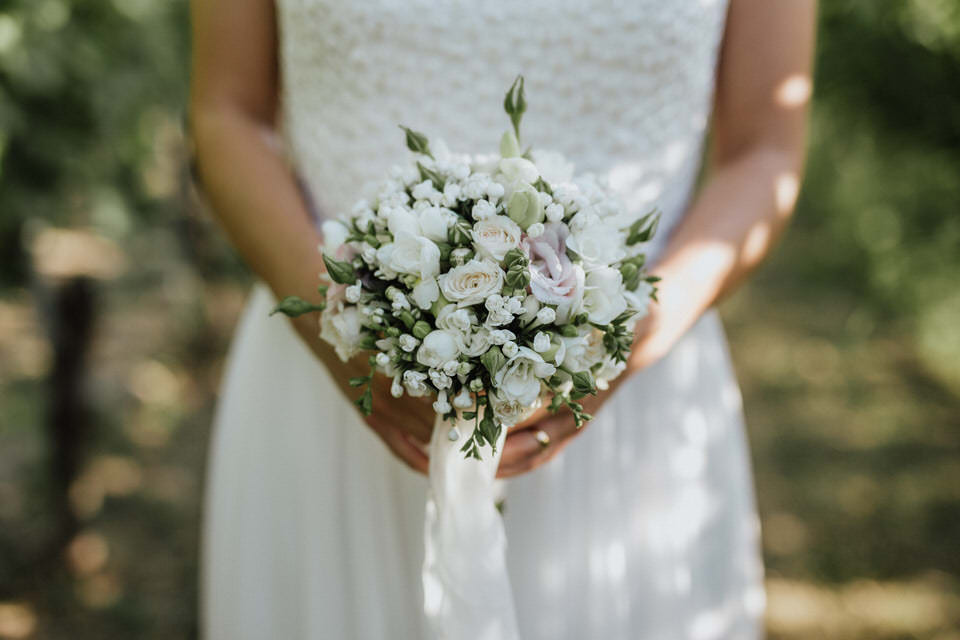 Seguendo lo stile dell’abito, abbiamo creato un bouquet romantico, dalla linea semplice, ricco di delicate nuances e di profumi inconfondibili, tali da evidenziare la bellezza della nostra sposa.