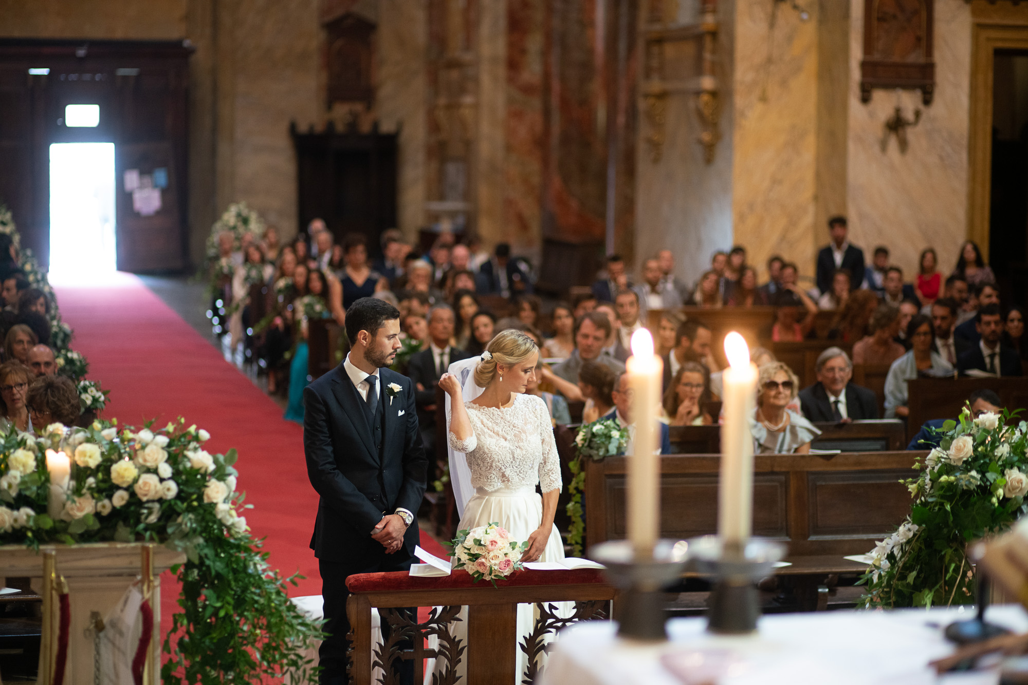 La celebrazione di rito cattolica si è svolta nella Chiesa dì San Massimo. La facciata in pieno stile neoclassico è stata da noi abbellita con due composizioni rigogliose su antichi vasi con colonna, che riprendevano il colonnato dell’edificio.