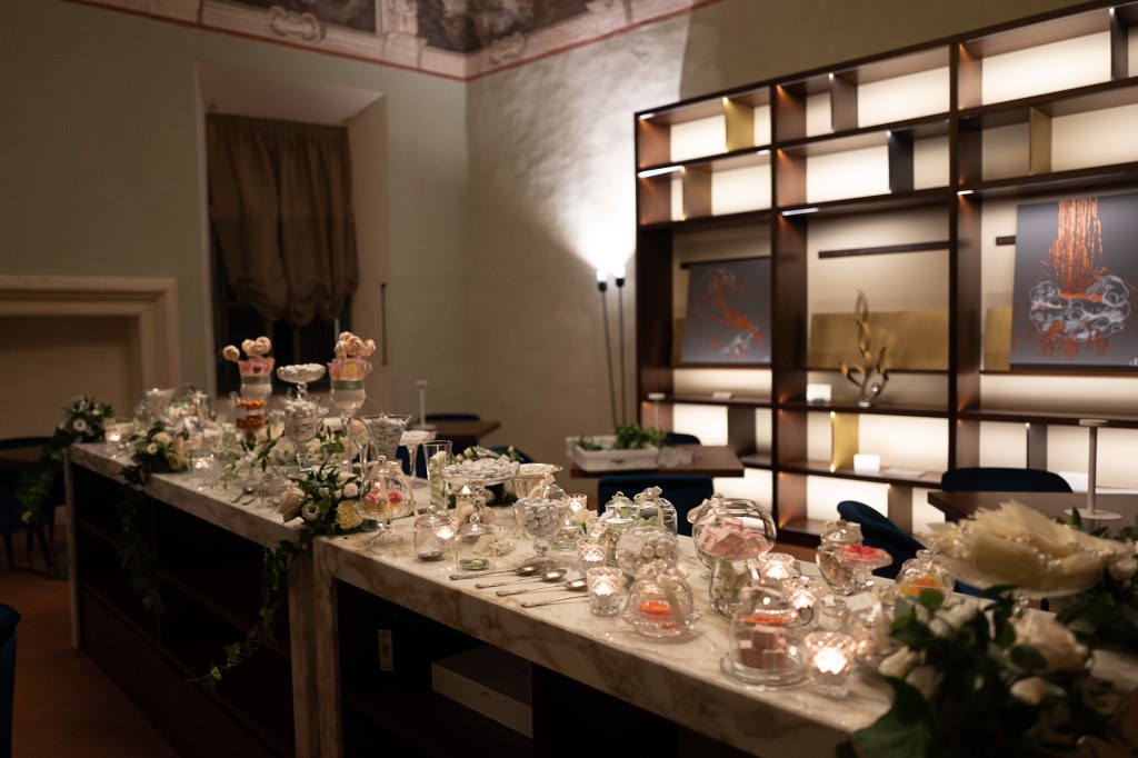 Per il post – serata abbiamo allestito su un tavolo in marmo presente in una delle sale affrescate la confettata, che unita dallo stile artistico dei soffitti e dai dettagli moderni degli oggetti, è diventata una sorta di oasi felice per tutti gli invitati.