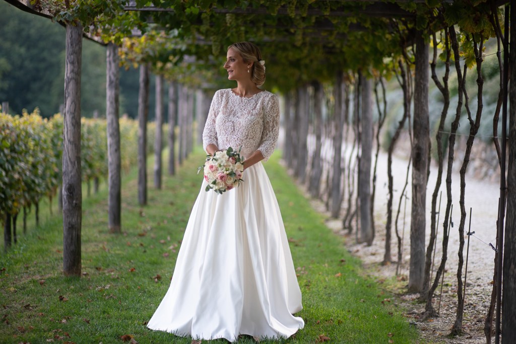 Vittoria per il suo giorno più bello ha scelto un abito dell’Atelier Emé: una gonna ampia in chiffon avorio e un crop top in pizzo macramé la rendevano un principessa super cool. Per il suo look abbiamo pensato di realizzare un bouquet dallo stile classico e dalle tonalità del panna e del cipria, con rose, peonie e lisianthus accostate all’eucalipto.