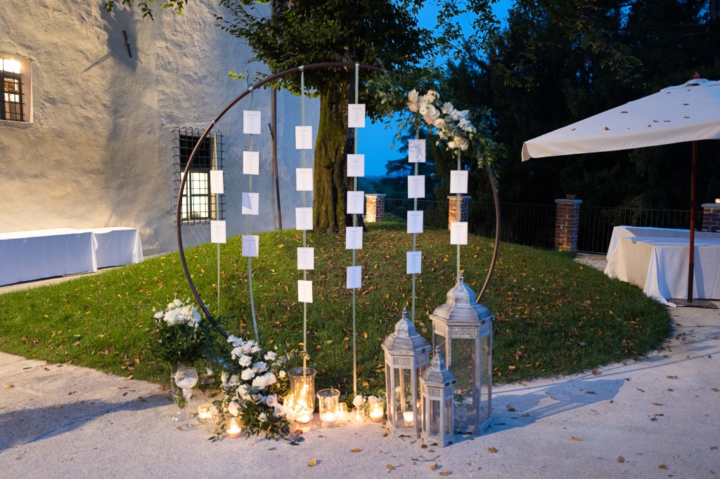 Il tableau de mariage si inseriva perfettamente nella scenografia realizzata: un grande cerchio in ferro battuto, progettato e realizzato insieme al nostro fabbro, a cui abbiamo appeso i biglietti con i nomi degli invitati. Tocco di fiori, lanterne moresche e luce hanno completato il tableau.