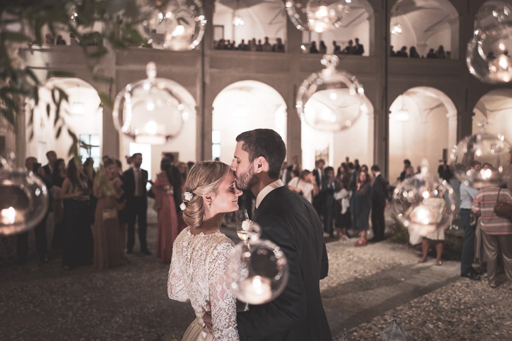 Dopo l’aperitivo, gli invitati sono stati accolti dagli splendidi affreschi della Sala di Giove. Intrisa di arte e di simbolismi la sala è stata da noi allestita con centrotavola dallo stile naturale e dalla forma rotonda, che avvolgevano un vaso di design tra trasparenze e giochi di luce.