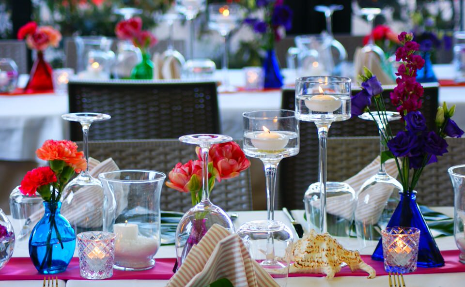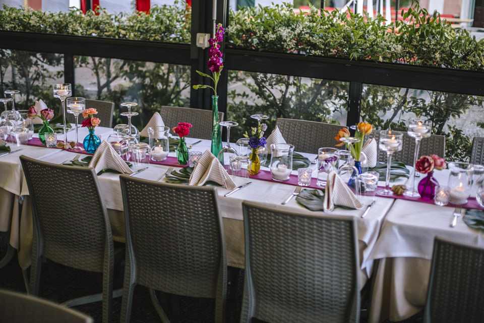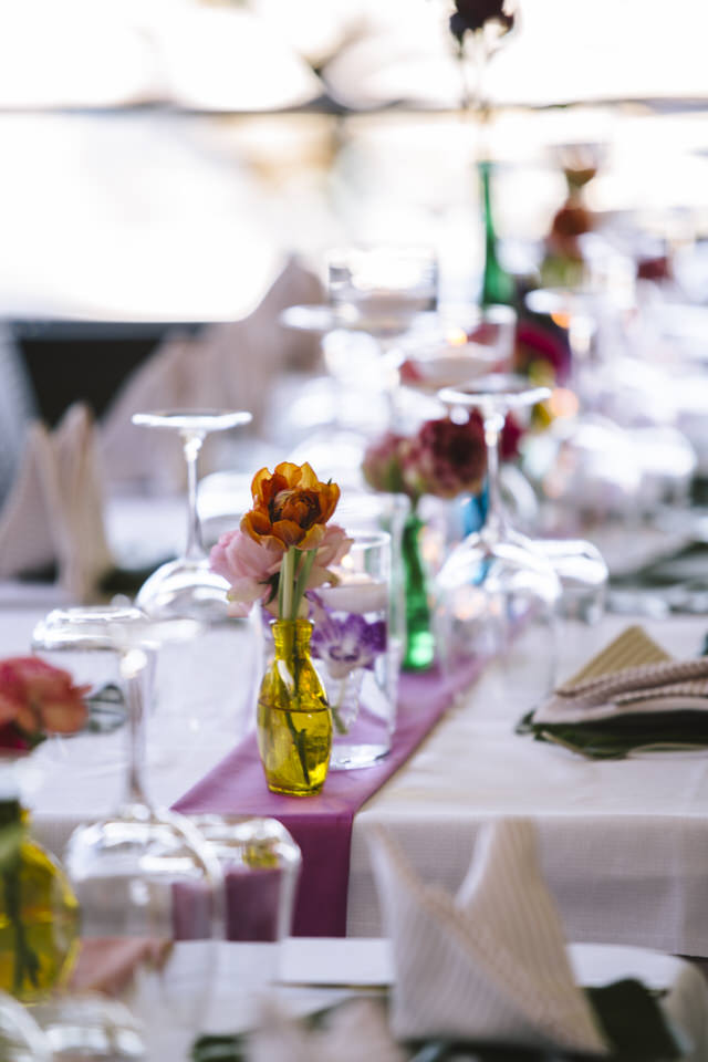 Seguendo lo stile tropicale della serata abbiamo decorato i numerosi tavoli imperiali con runner dalle differenti sfumature cromatiche: si alternavano tessuti dai toni del rosa e dell’arancione sino ad arrivare a nuances più accese. Come un sentiero di coloreabbiamo poi posizionato boccette geometriche di vetro impreziosite da lisianthus, rose inglesi, ma anche violaciocche e garofani dalle diverse sfumature. Candele immerse nell’acqua, orchidee e conchiglie arricchivano la scenografia creando un gioco di altezze lungo tutto il runner.