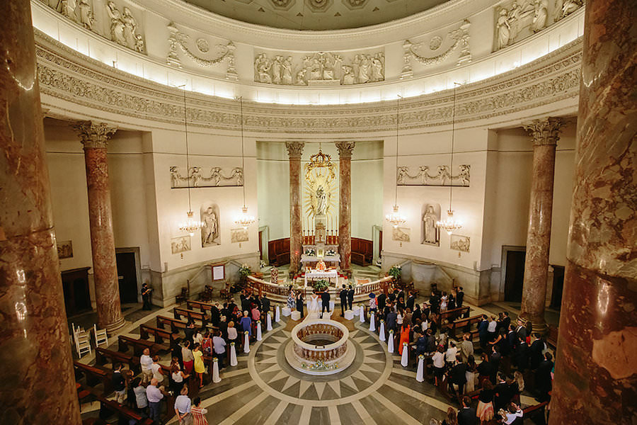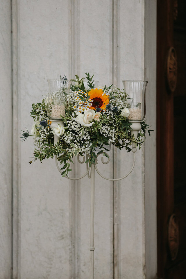 Gli ambienti neoclassici della Chiesa sono stati da noi decorati con composizioni floreali colme di margherite e impreziosite dall’infiorescenza del girasoli. I fiori sono stati poi immersi in una nuvola di gypsophila, foglioline di pitosphoro e un pizzico di blu dell’eryngium.