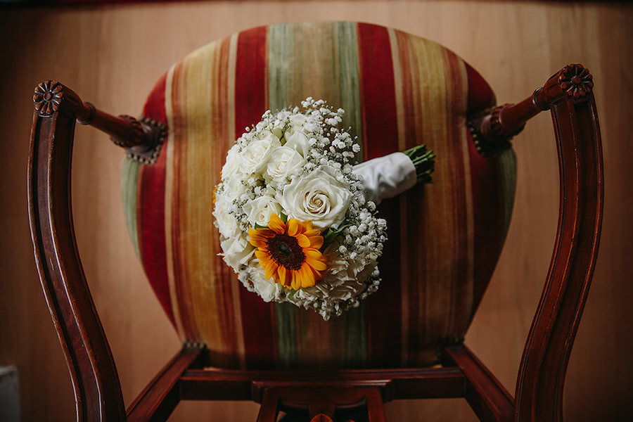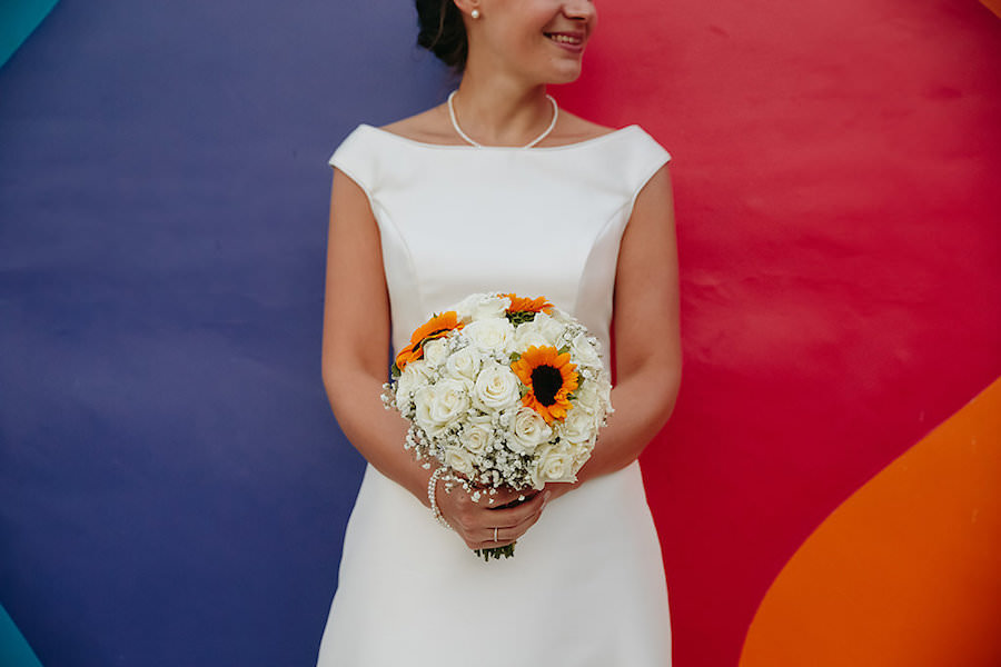 La semplicità di Enrica si nota fin da subito dall’outfit scelto nel suo giorno più bello: un abito dell’Atelier Claraluna Sposa dalla linea semplice ma molto raffinato. Per l’entrata in chiesa abbiamo creato un bouquet petit, decorato dal disegno delle rose e dal gioco di colore dei girasoli.