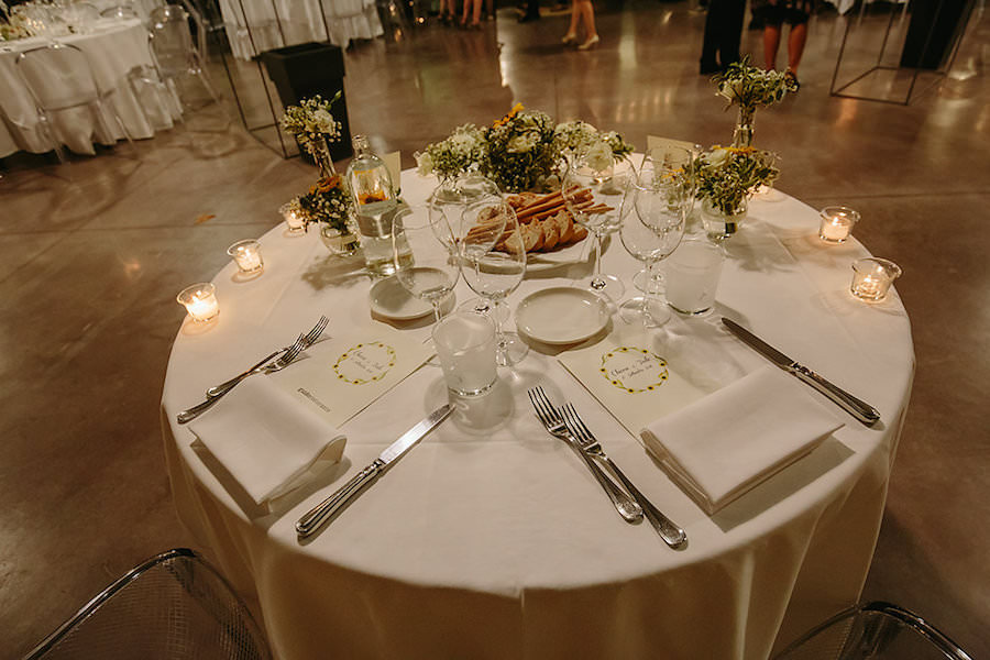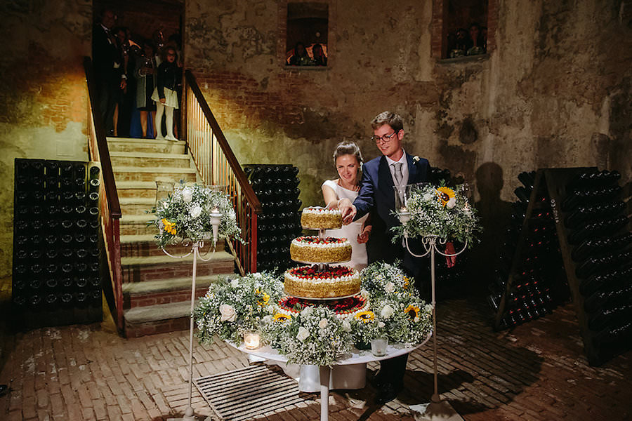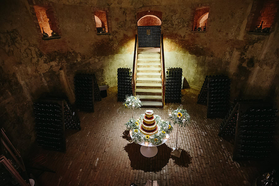 Dopo aver provato i piatti dello Chef stellato Ugo Alciati, la festa è proseguita nella Ghiacciaia della location. In un luogo magico, immerso in un’atmosfera di luci ed ombre, abbiamo allestito il tavolo della wedding cake. La torta è stata circondata da nuvole di gyposphila e punti luce per ricreare la magia di questo dolce momento.