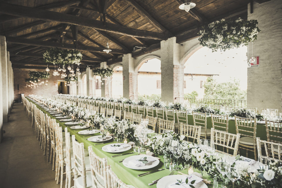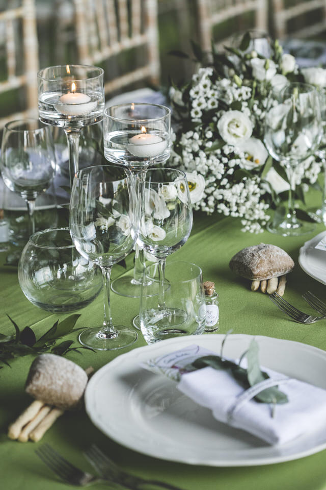 Cespugli di fiori alternati da punti luce di diversa altezza hanno composto il centrotavola, creando otticamente due lunghi runner posizionati sui tavoli imperiali. Nulla è al caso, i dettagli sono stati preziosi per completare questa romantica scenografia: il tovagliato verde prato, l’argenteria della mise en place, il tocco di foliage come segnaposto e le sedie in tinta…