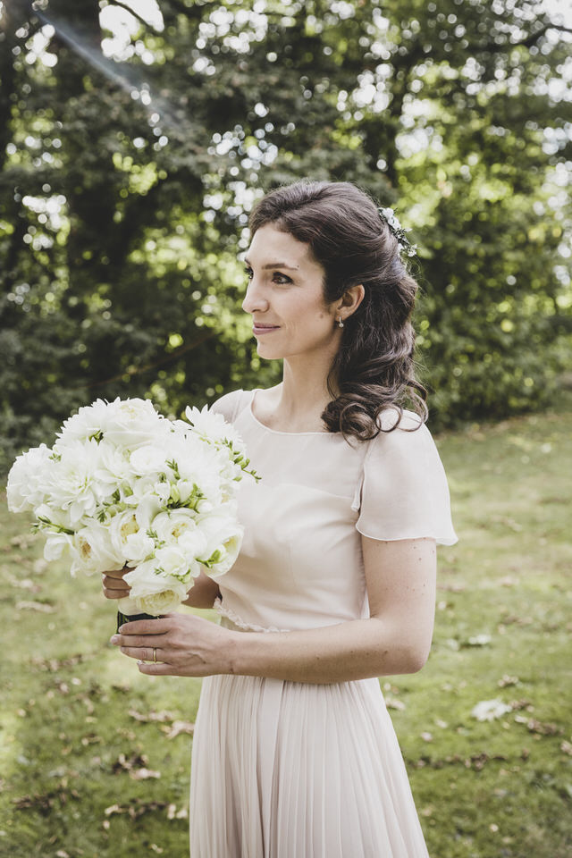 Per lei abbiamo pensato ad un bouquet avvolto dalla bellezza d’altri tempi. Grazie alle nuances color panna abbiamo realizzato un bouquet naturale di rose, alternato alla fragranza delle fresie e all’eleganza delle dalie.