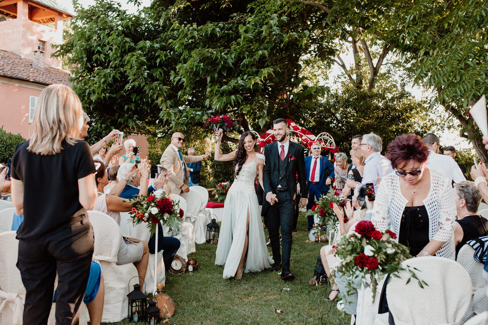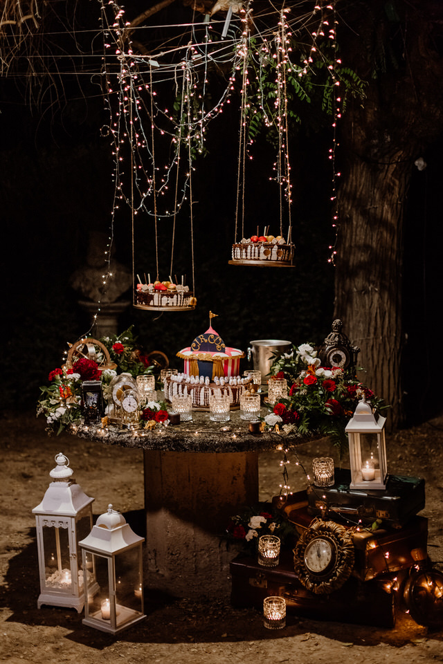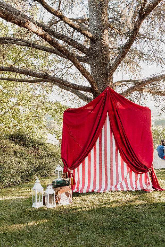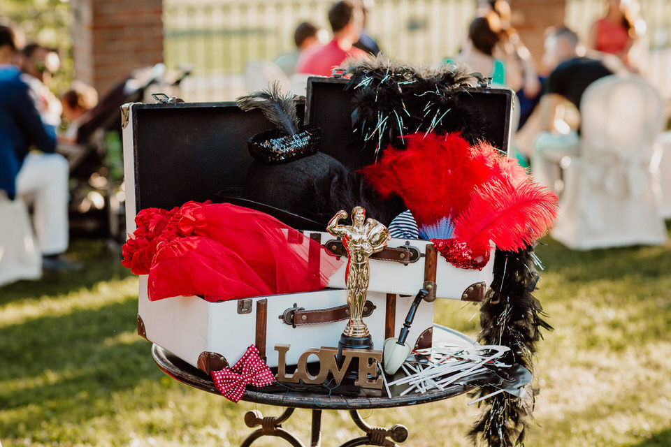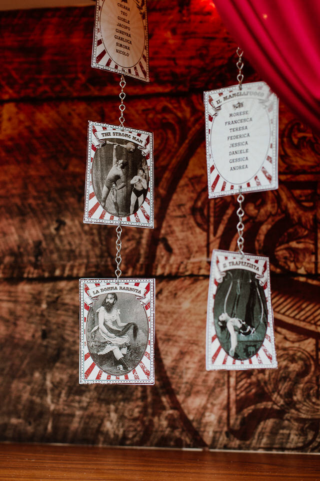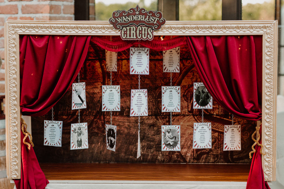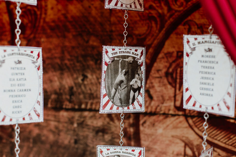I nostri sposi si sono detti sì con una cerimonia all’aperto, impreziosita dai dettagli floreali e dagli accessori vintage, che ricordano le scenografie dei primissimi spettacoli circensi. Ispirato alla drammaturgia muta della tradizione russa e alle acrobazie in volo degli artisti del Cirque du Soleil l’aperitivo si è trasformato in una grande festa, dove ogni angolo era un effetto a sorpresa e dove il tableau de mariage presentava gli artisti di questo magico mondo.
