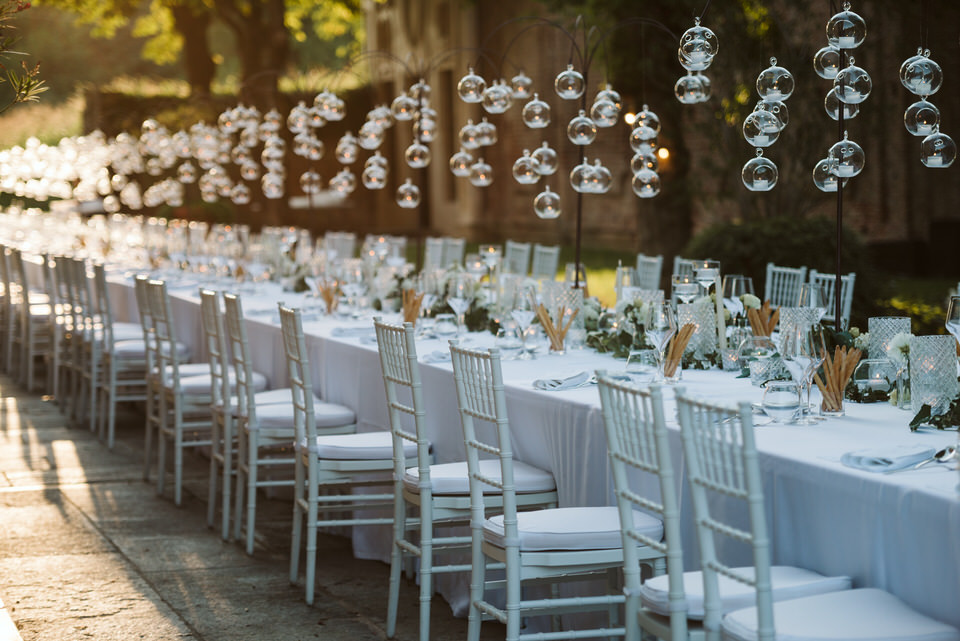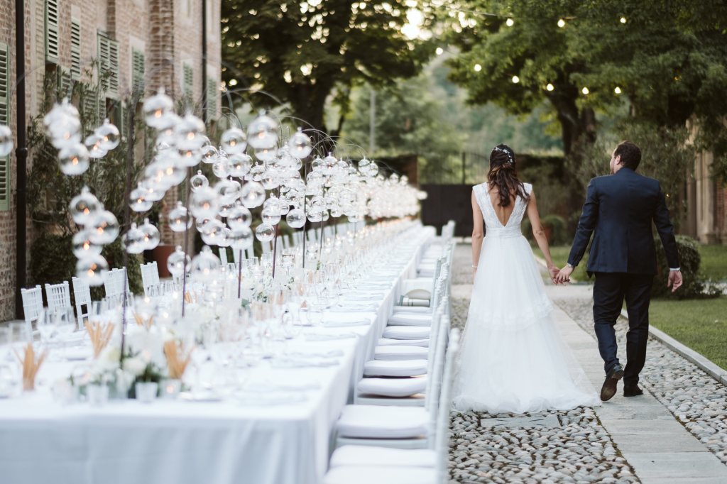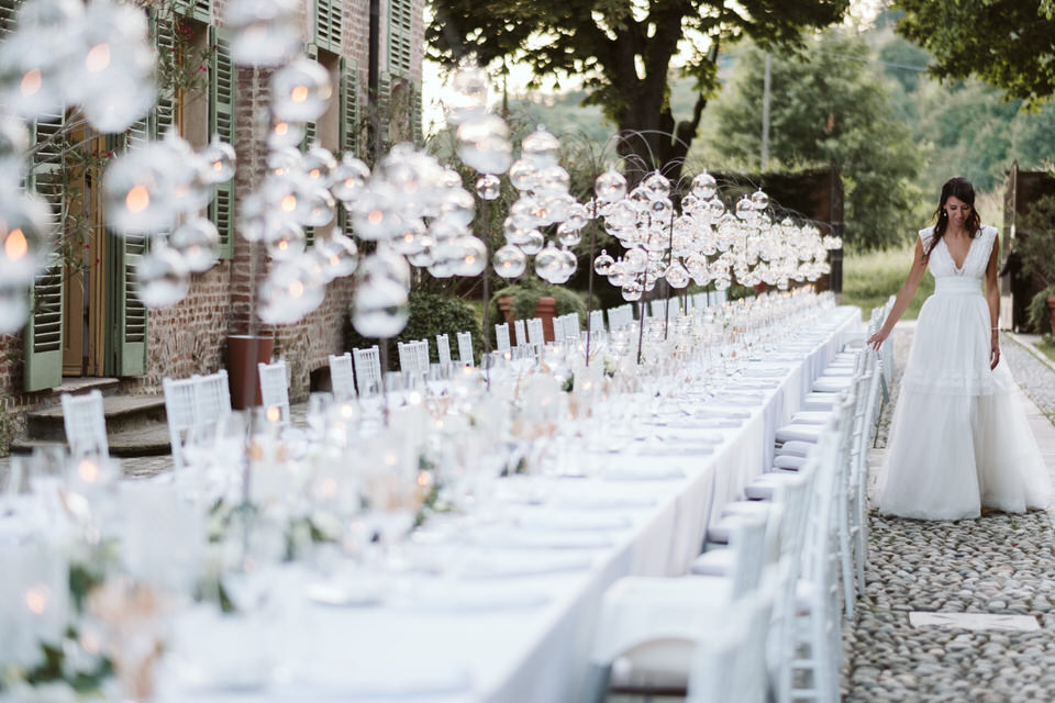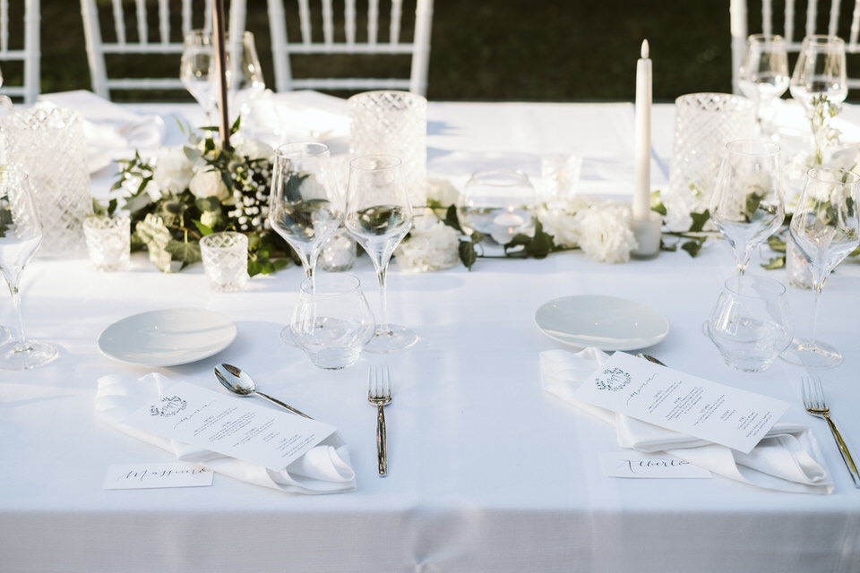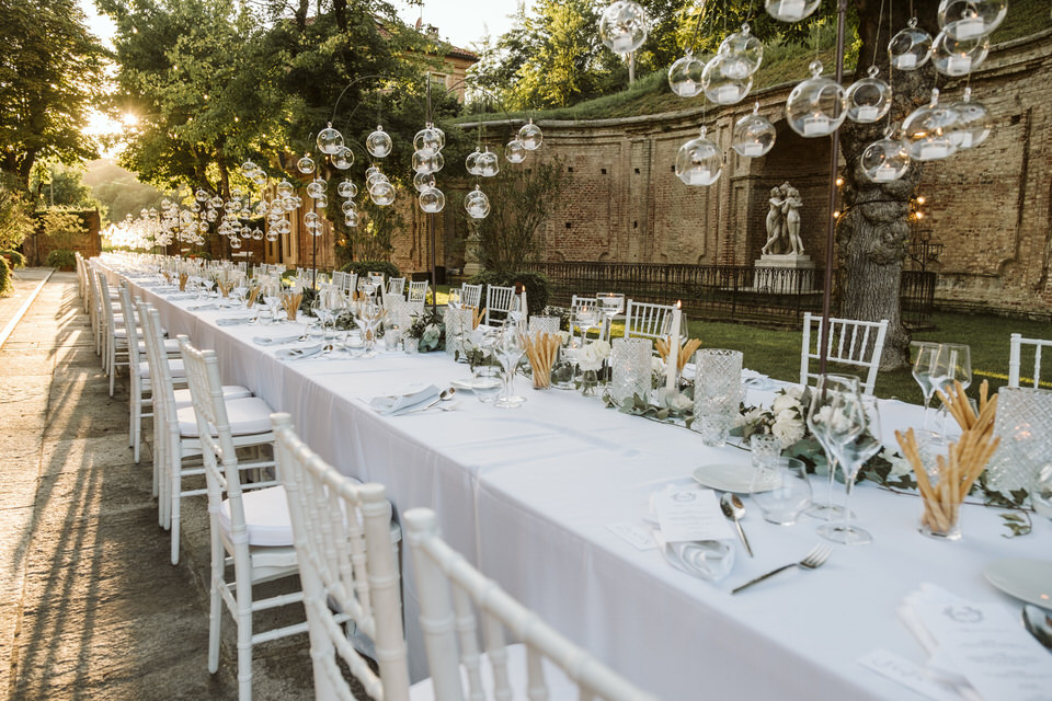Dal rito nel giardino segreto sino al momento del ricevimento, dove un tavolo imperiale illuminato dalle lucine sospese e dai preziosi dettagli del runner ha regalato un momento conviviale a tutti i commensali. Un centrotavola realizzato con il movimento delle boules di vetro, che ricorda una leggera onda di bolle di sapone sospesa lungo tutto il tavolo. Situato nel sentiero che porta all’antica fontana della villa, dall’atmosfera intima e romantica, il tavolo è stato poi impreziosito dagli elementi di design, di vetro e cristallo, e dal tepore delle numerose candele, che hanno unito gli sposi e i loro invitati in un unico abbraccio, pieno di magia e di emozione.