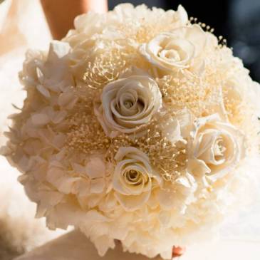 Un bouquet di rose, gypsophila e ortensia per dare un effetto soffice e dettagli in pizzo e in tessuto per renderlo elegante. … More BOUQUET FOCUS: romantic, shabby, elegante il Bouquet Simona